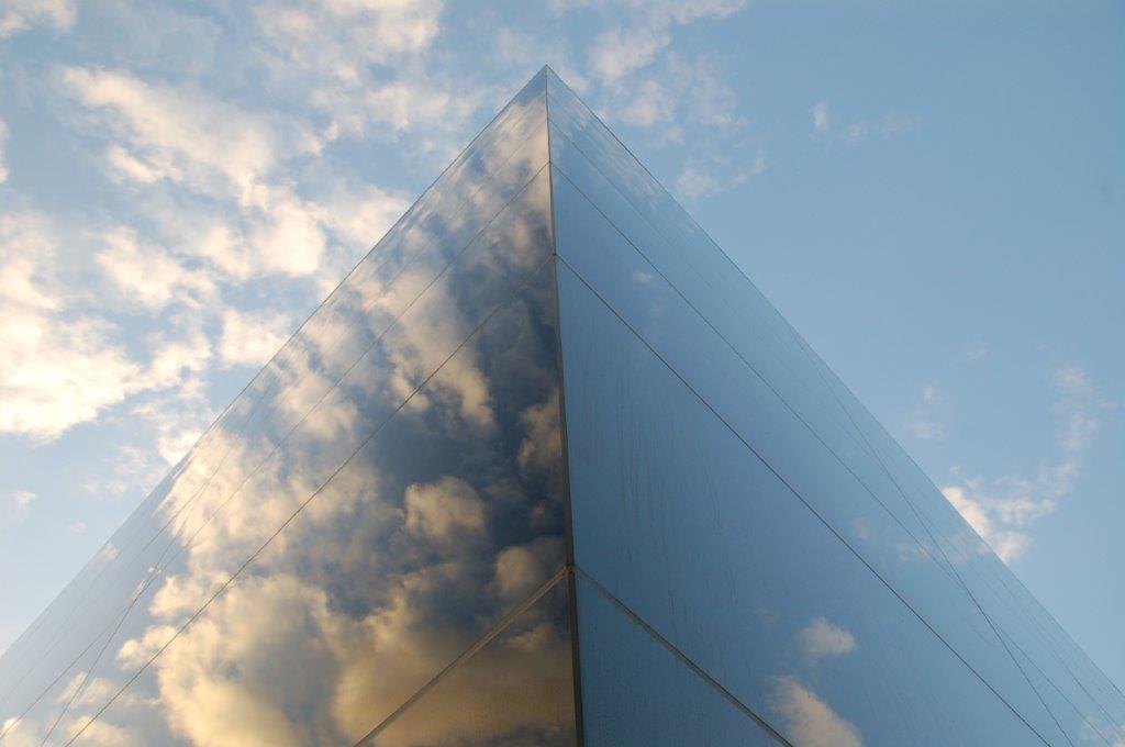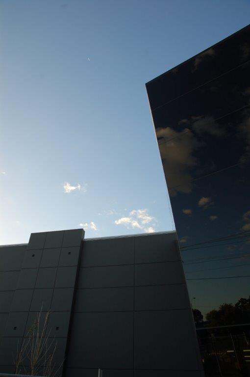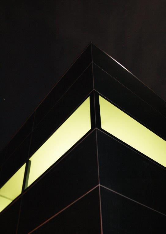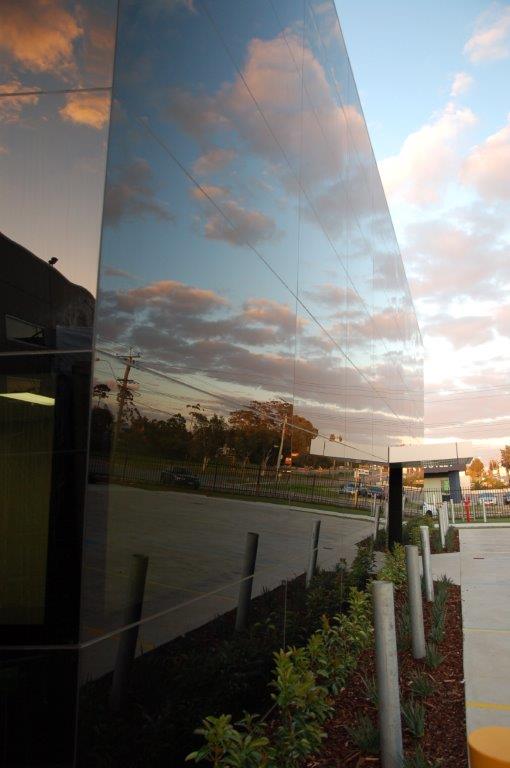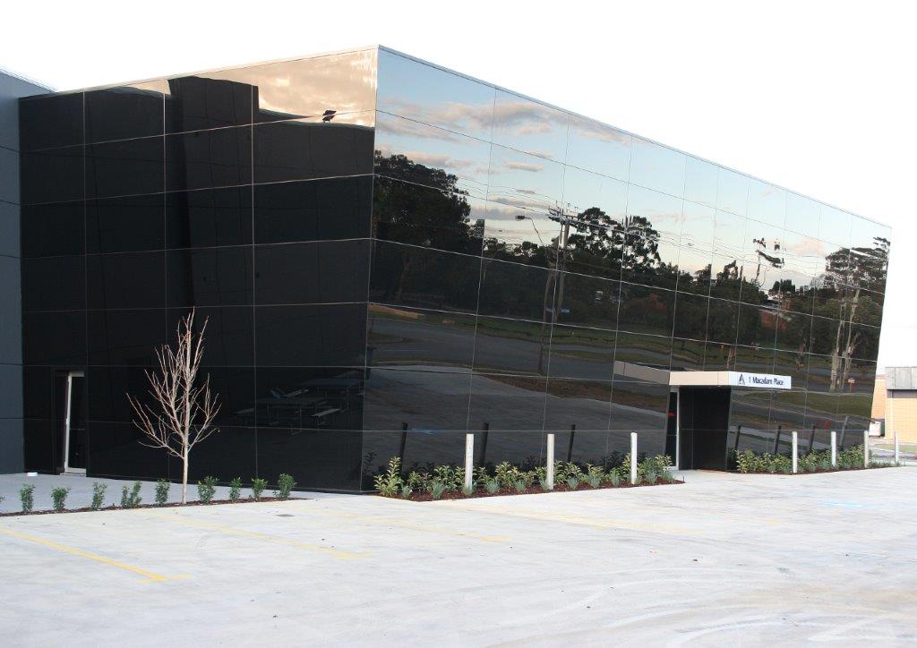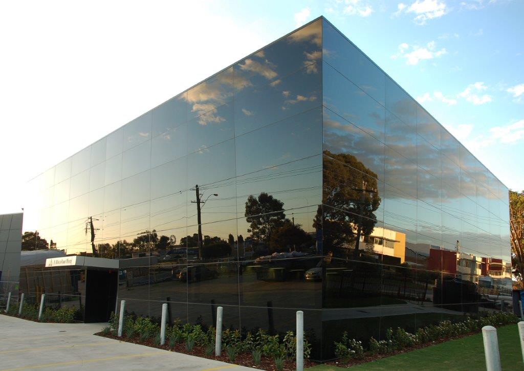 Appearing as a reflective prism on a large corner lot, this modern laboratory leans heavily into a futuristic aesthetic. The fully glazed exterior of the office space presents towards the road, with tinted panels creating a seamless look.