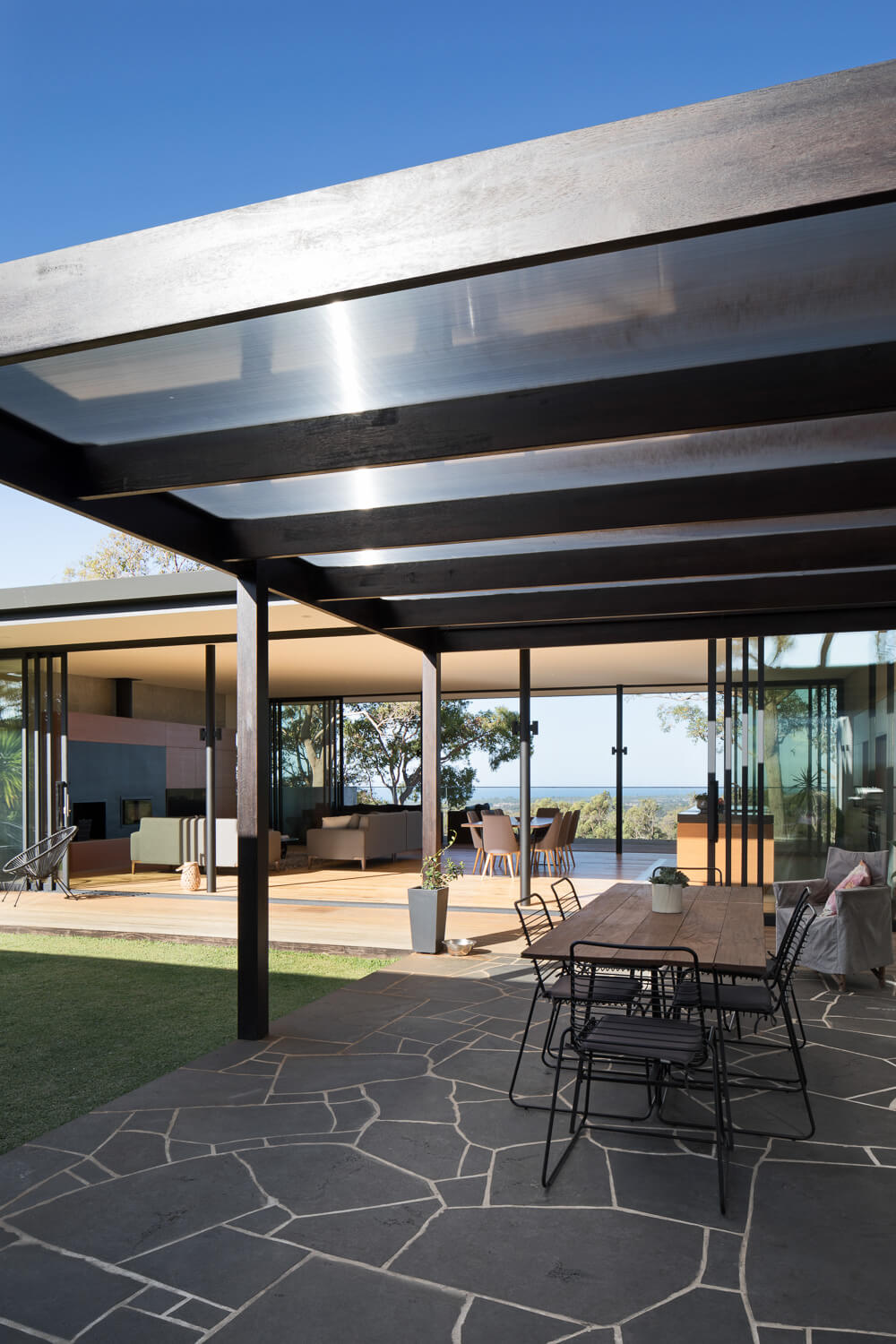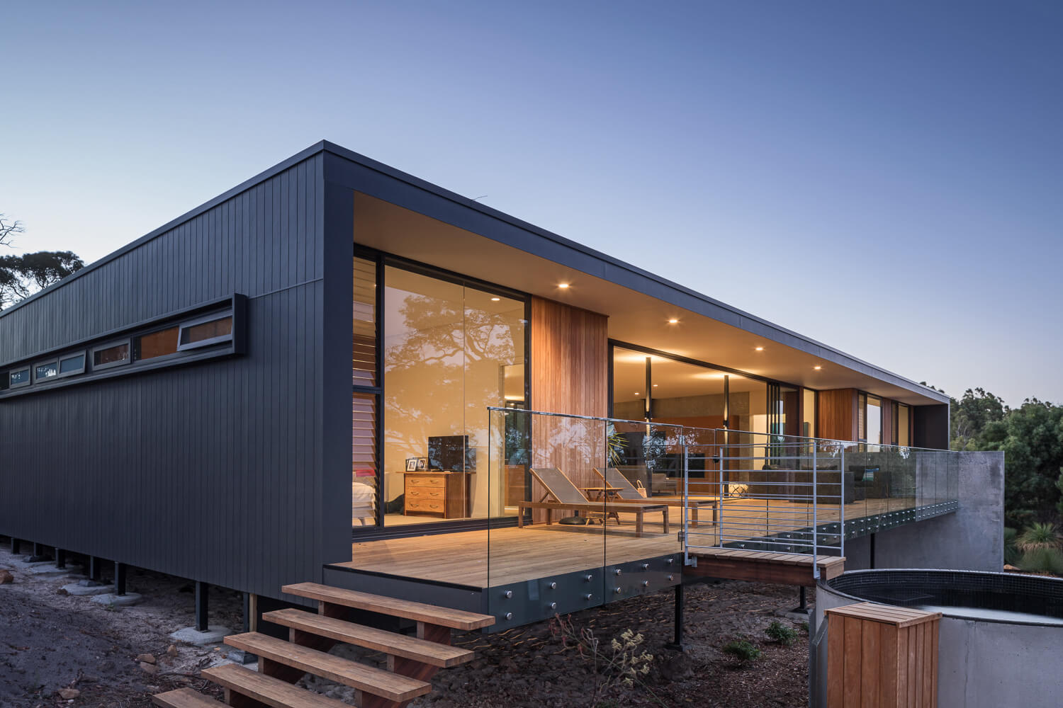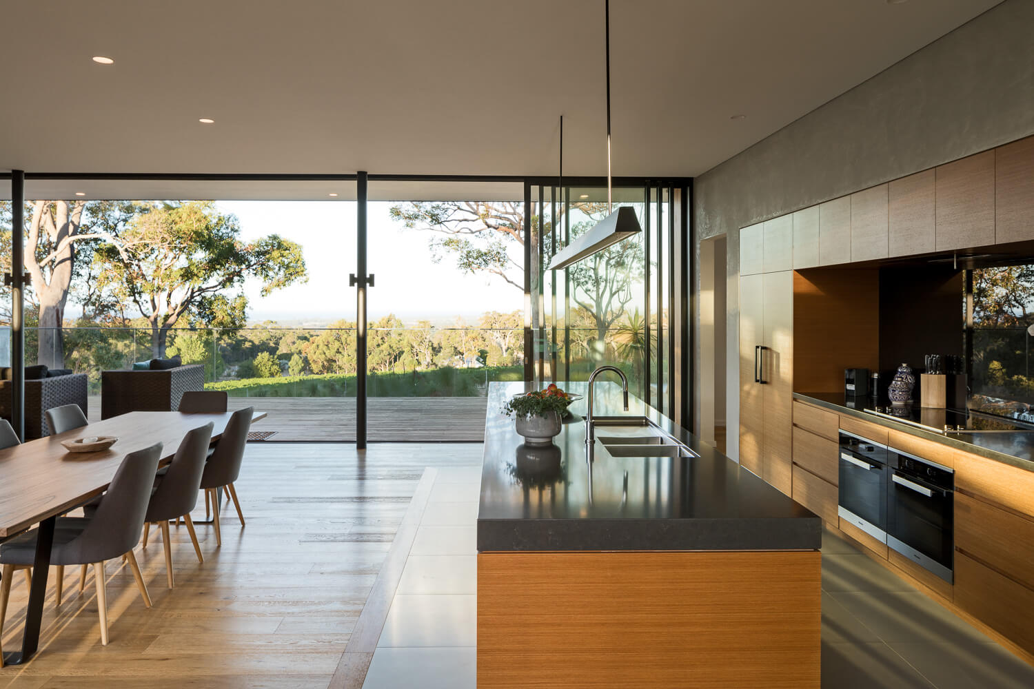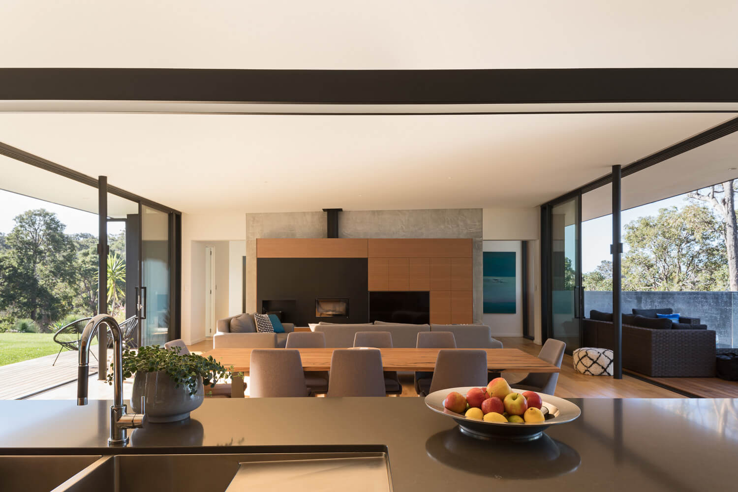 Working closely with the builder to create a highly considered and modern design, this award-winning home appears effortless in its place. Full height glazing captures beautiful views of surrounding wineries and vineyards. The monolithic shape projects out from the hill, supported by the ‘V’ shaped steel supports, giving the building an apparent weightlessness.