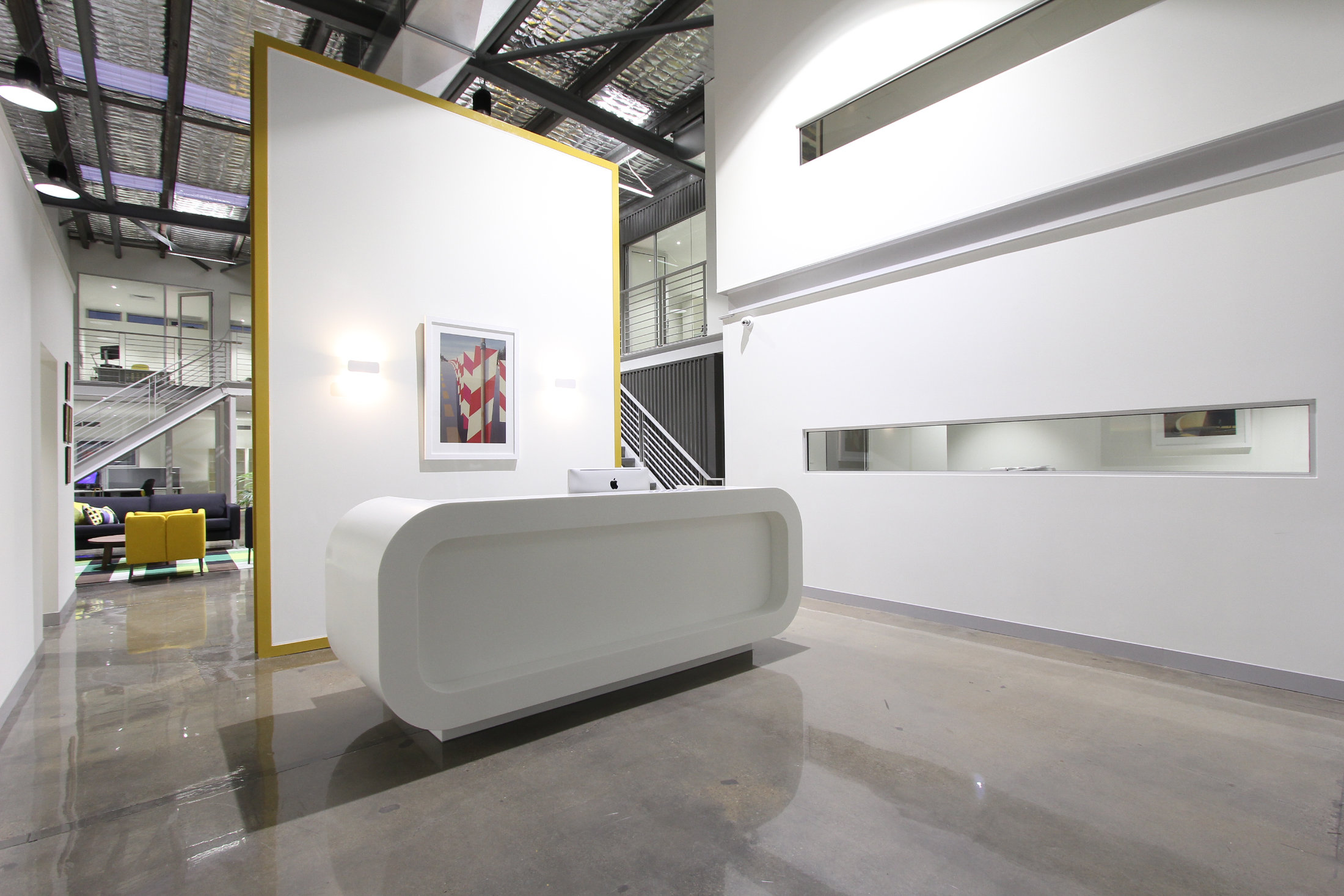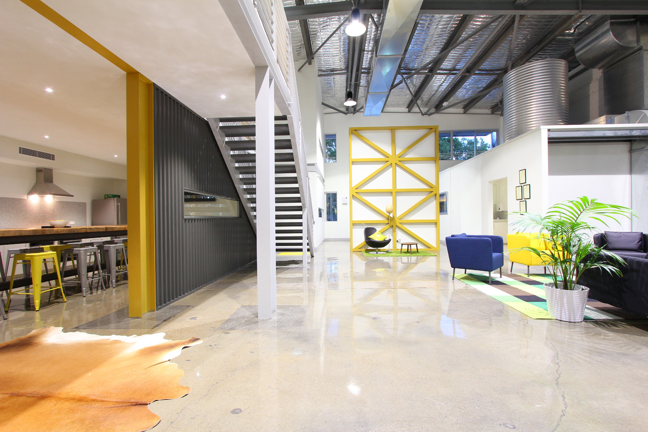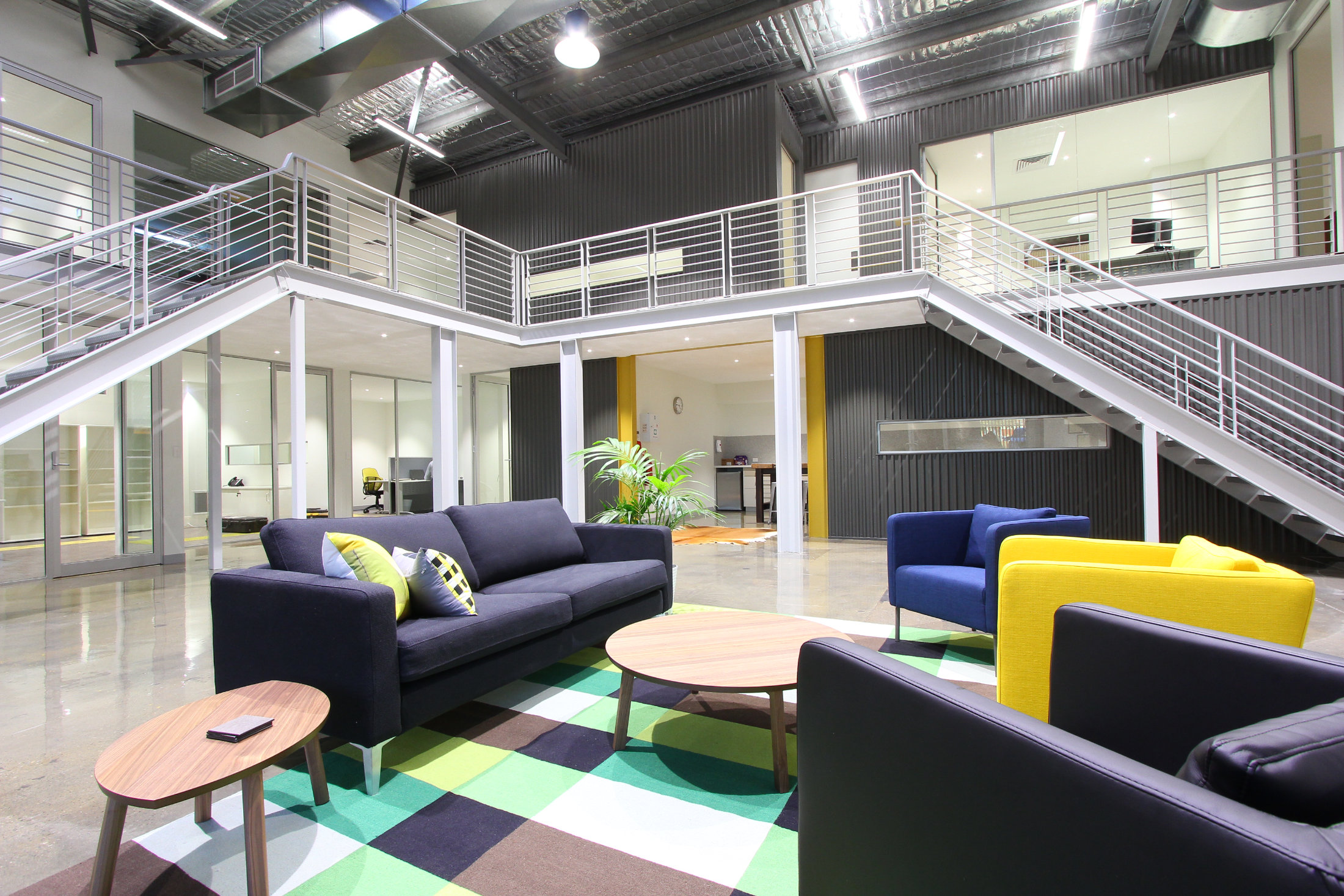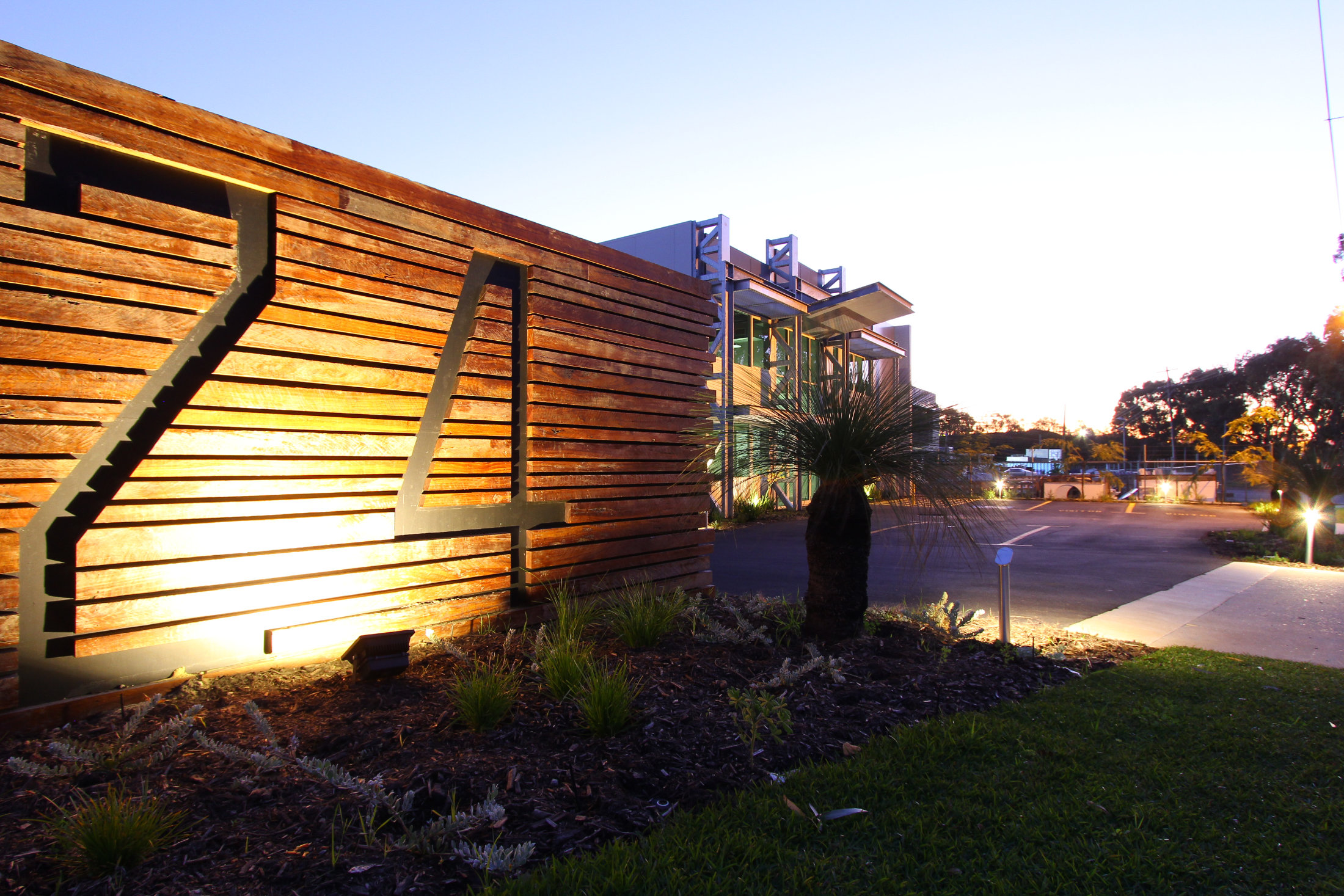 The existing 1960’s warehouse was the frame for this addition and complete makeover. From a run down, dysfunctional building, the studio transformed it into a stylish warehouse & office space. As part of this redesign, a new mezzanine floor and raised roof were used to create a practical floor plan that met the new businesses’ needs. The existing power substation at the very front of the site was cleverly disguised with a recycled timber sleeper feature, also incorporating the address.